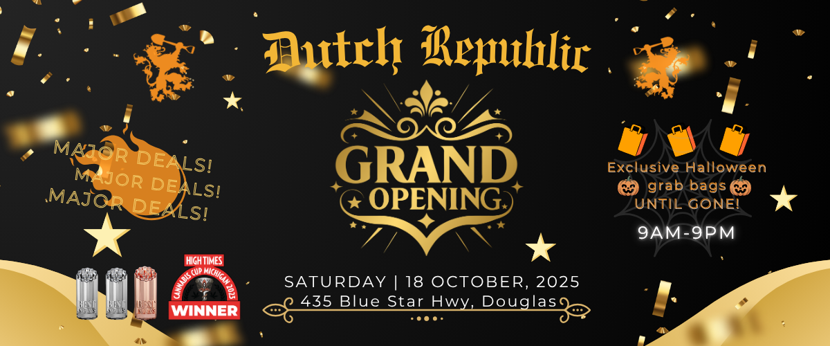 Step into the world of Dutch Republic, the newest chapter in a journey more than 20 years in the making. Powered by our award-winning brand Dutch Touch Genetics—celebrated for precision cultivation, relentless pursuit of excellence, and major wins like 1st Place High Times Cannabis Cup with Mr. Clean, 2nd Place Best in Grass with Lemon Wookie, and several additional awards across concentrates, RSO, and disposable vapes— we’ve now expanded westward into Douglas, bringing our craft and community to Michigan’s lakeshore.